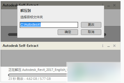 1、运行Revit 2017安装包,选择解压目录,目录不要带有中文字符,解压需要5.77GB空间
