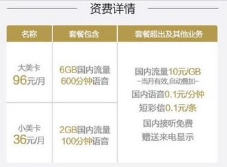 大美卡:月费为96元,套餐内容包含6GB国内流量 600分钟国内语音,超出套餐国内流量10元/GB,国内语音0.1元/分钟;