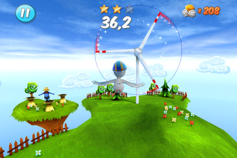 游戏操作比较普通,也比较简单,没有常见的操控按钮,就是倾斜机身,控制飞鸟在天空上飞翔。游戏难度不高,大致的玩法要求,无非是限时通过指定的倒数圈圈,或者是收集漂浮在天空的金币银币,在不撞电线杆树木和地面的前提下,到达位处最深处的大风车,当中要点,基本就是闪避中间的障碍和最后大风车不断旋转的风叶。